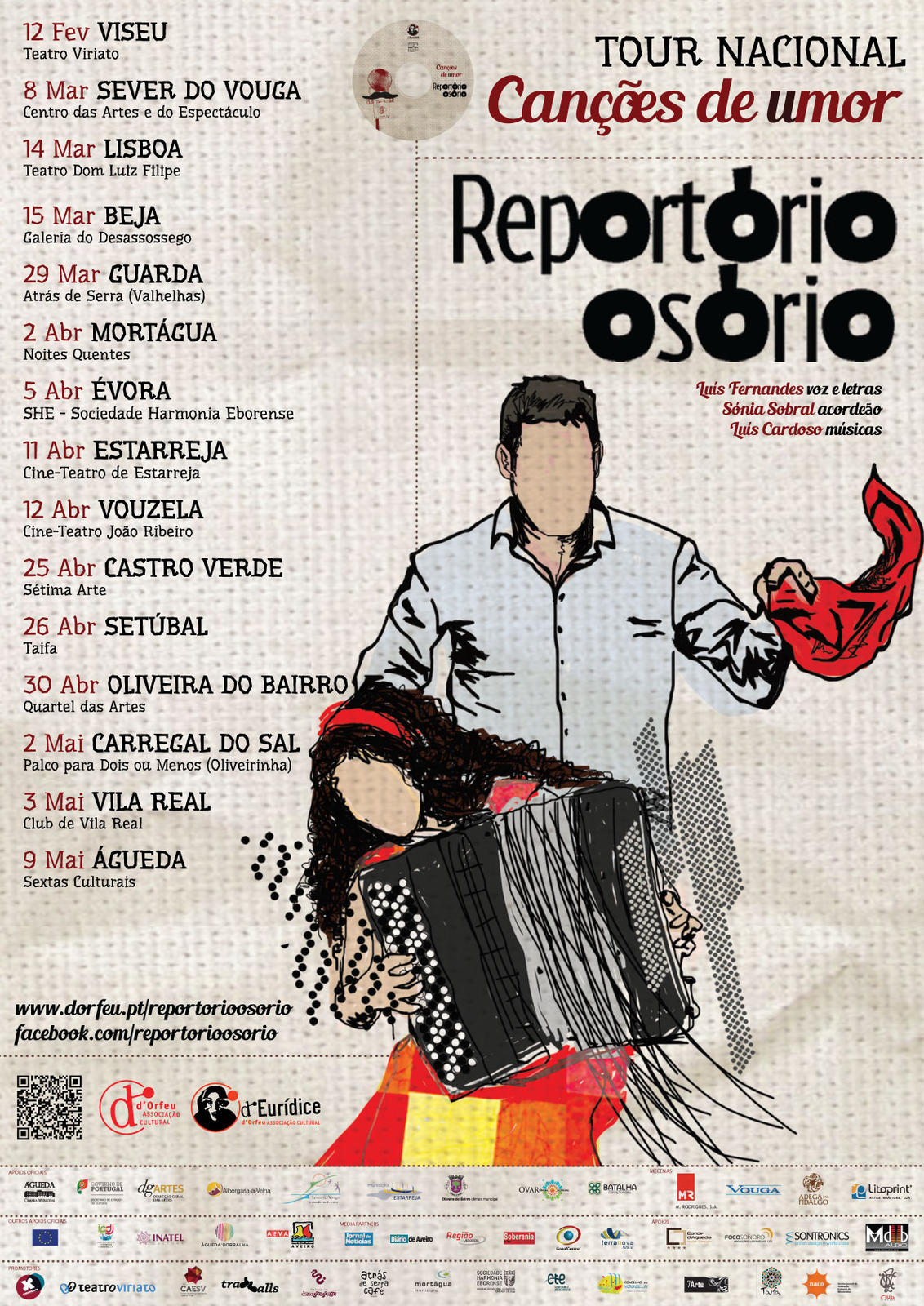 Após a apresentação aclamada pelo público no Teatro Viriato, em Viseu, no passado 12 de fevereiro, "Reportório Osório" prossegue a sua tour nacional já no próximo sábado, dia 8 de março, às 22:00, no Centro das Artes do Espectáculo em Sever do Vouga. De seguida, o dueto de Luís Fernandes (voz e interpretação) e Sónia Sobral (acordeão) conta com uma agenda de apresentações intensa e geograficamente diversificada: Teatro Dom Luiz Filipe, em Lisboa (14 de março); Galeria do Desassossego, em Beja (15 de março); Atrás de Serra, na Guarda (29 de março); Centro de Animação Cultural de Mortágua (2 de abril); Sociedade Harmonia Eborense, em Évora (5 de abril); Cine-Teatro de Estarreja (11 de abril); Cine-Teatro João Ribeiro, em Vouzela (12 de abril); Sétima Arte, em Castro Verde (25 de abril); Taifa, em Setúbal (26 de abril); Quartel das Artes, em Oliveira do Bairro (30 de abril); Festival "Palco para Dois ou Menos", em Carregal do Sal (2 de maio); Club de Vila Real (3 Maio) e Cine-Teatro São Pedro, em Águeda (9 de maio).