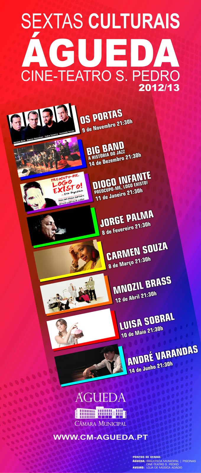Fica, assim, apresentado o programa Sextas Culturais 2012/2013. A Autarquia deixa o convite e lança o desafio, para que todos os munícipes, bem como todos aqueles que se queiram deslocar até Águeda, passem a ter um óptimo serão cultural todas as segundas sextas-feiras de cada mês.