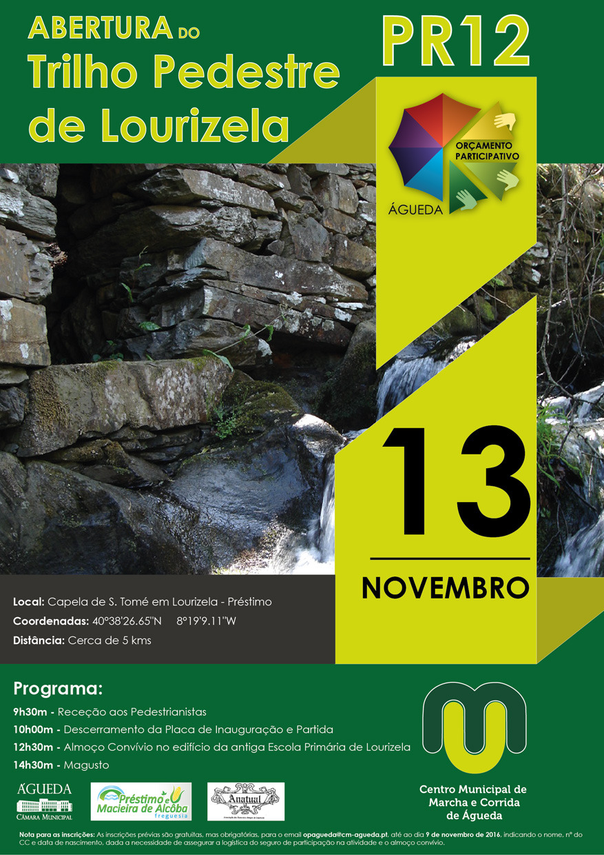 Realiza-se no próximo dia 13 de novembro, domingo, às 9:30, junto à Capela de São Tomé em Lourizela, a inauguração do projeto vencedor da edição 2015 do OP-Águeda: o Trilho Pedestre de Lourizela (PR10), na União de Freguesias de Préstimo e Macieira de Alcôba.
