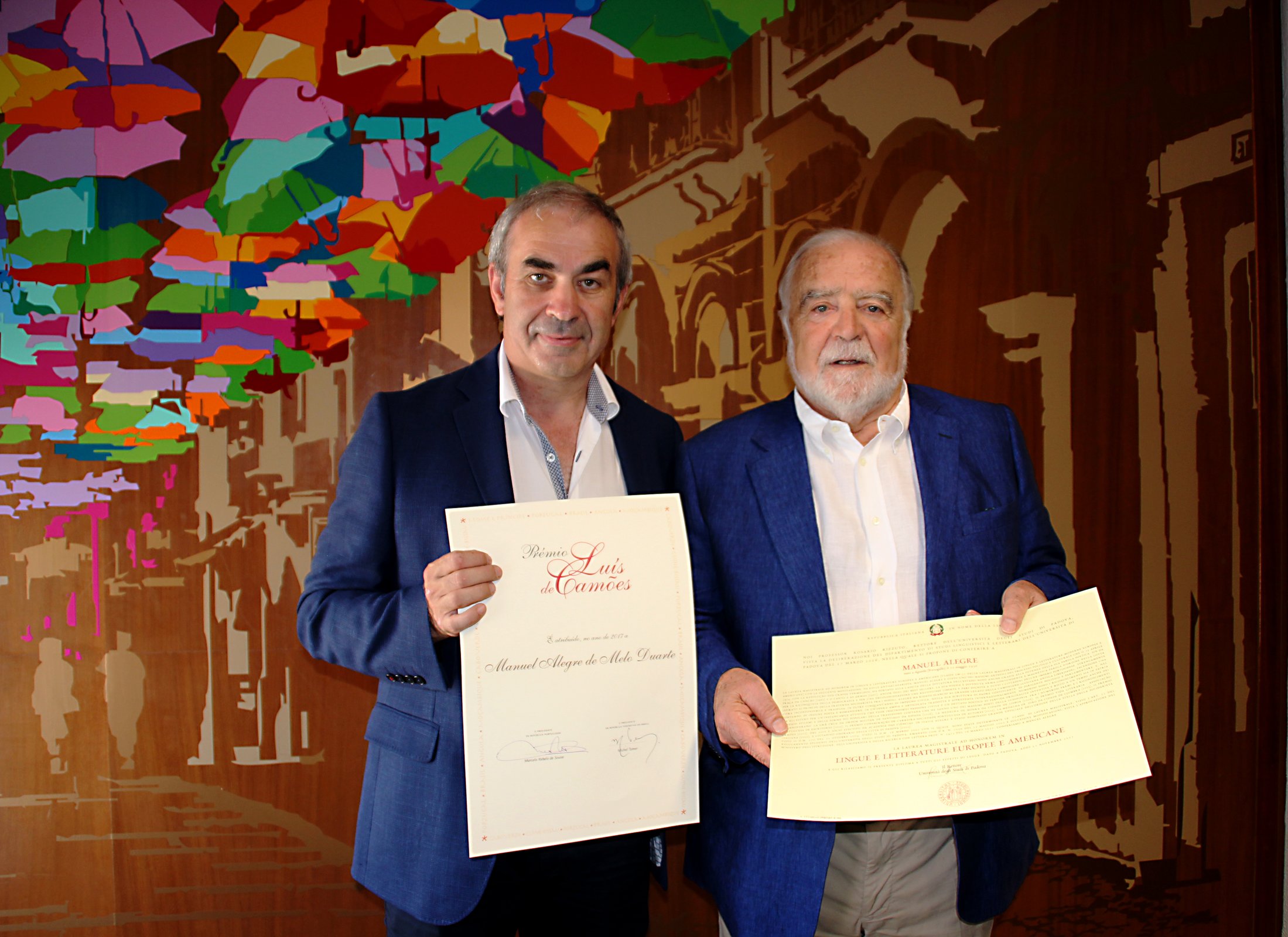 Num gesto simbólico de profunda amizade à sua terra, ofereceu esses diplomas ao Município de Águeda, na passada terça-feira dia 14 de agosto, numa cerimónia privada que decorreu nas instalações da Câmara. Estiveram presentes Jorge Almeida, Presidente da Câmara Municipal, Edson Santos, Vice-Presidente, Mafalda Maria, esposa de Manuel Alegre, Rui Breda, amigo do escritor e Gil Nadais, antigo Presidente do Município de Águeda.