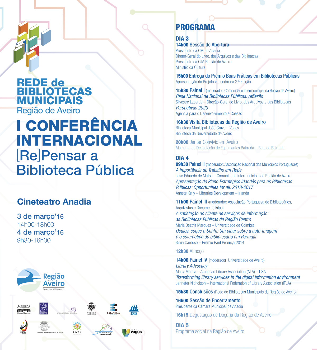 A Comunidade Intermunicipal da Região de Aveiro vai realizar, nos dias 3 e 4 de março, no Cineteatro de Anadia, a 1ª Conferência Internacional Bibliotecas Municipais Região de Aveiro, subordinada ao tema “(Re)Pensar a Biblioteca Pública”.