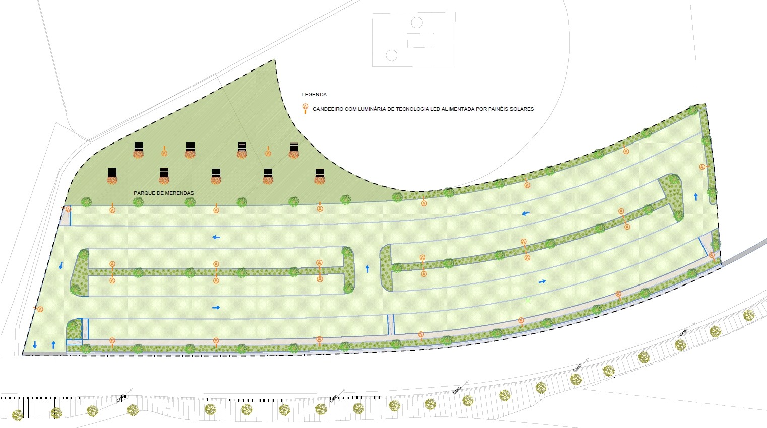 Ao nível da iluminação, está prevista a aplicação de candeeiros com luminárias de tecnologia LED, que, confome mencionado anteriormente serão alimentadas por painéis solares. A área de iluminação abrange a zona de lazer, as zonas de estacionamento e os respetivos circuitos de peões e de veículos.