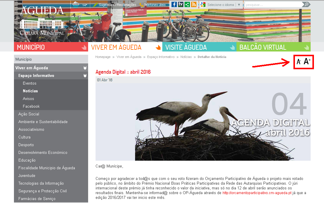 O portal da Câmara Municipal de Águeda implementou recentemente uma melhoria na sua acessibilidade: a criação de mecanismo para aumentar e diminuir o tamanho da letra.