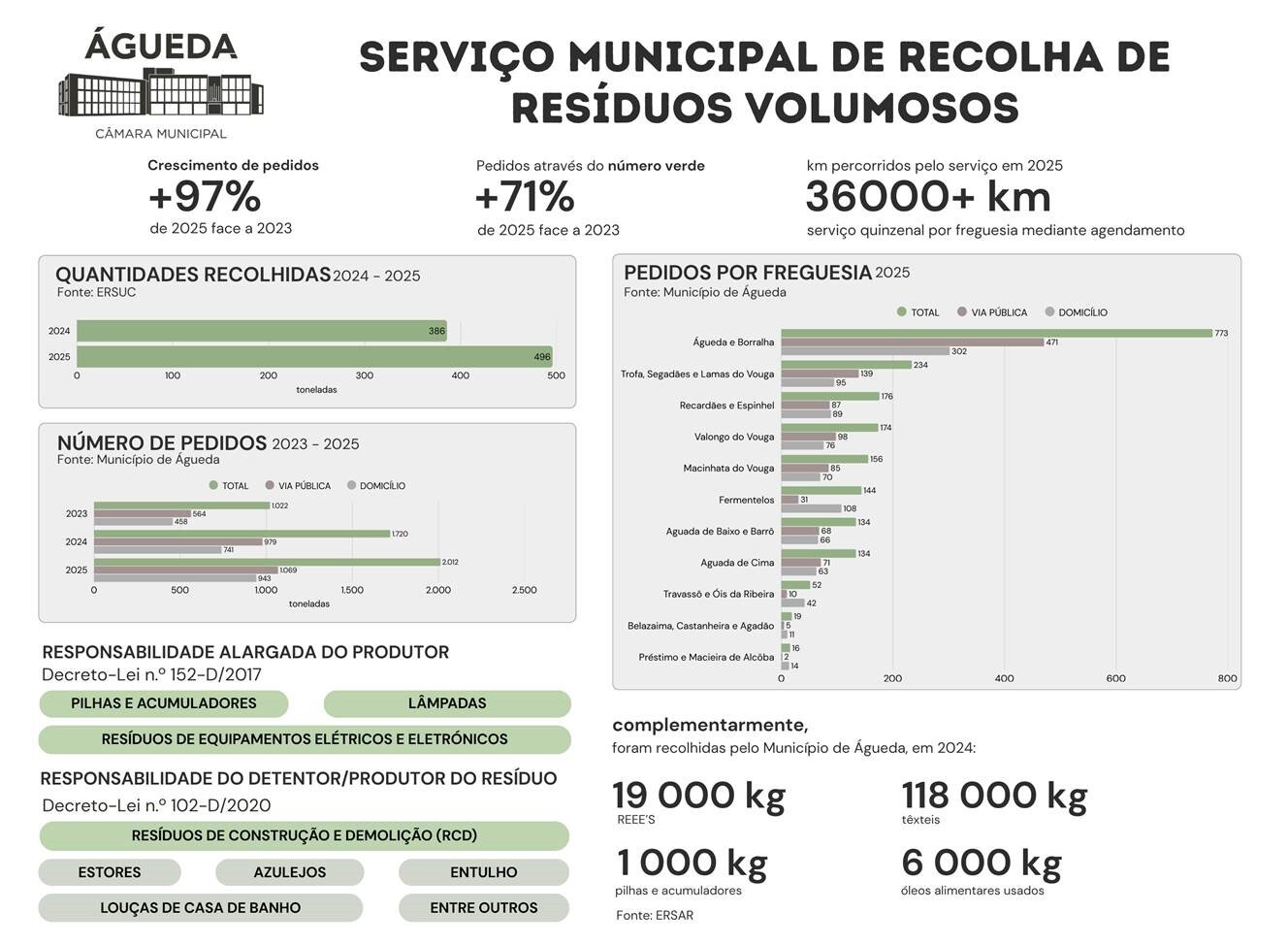 O serviço municipal de recolha de resíduos volumosos (“monos”) do Município de Águeda, gratuito e acessível a qualquer cidadão, registou um crescimento significativo nos últimos dois anos. Em 2025, o número de pedidos aumentou 97% face a 2023, enquanto as solicitações efetuadas através da Linha Verde cresceram 71% no mesmo período.