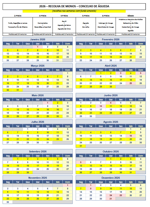 A recolha realiza-se com periodicidade quinzenal, de acordo com um calendário pré-definido por freguesia, sendo necessário proceder ao agendamento até 48 horas antes da data prevista. O calendário encontra-se disponível no site da Câmara Municipal de Águeda (www.cm-agueda.pt/viver/ambiente-e-sustentabilidade/residuos/residuos-solidos-urbanos) e é partilhado com todas as freguesias.