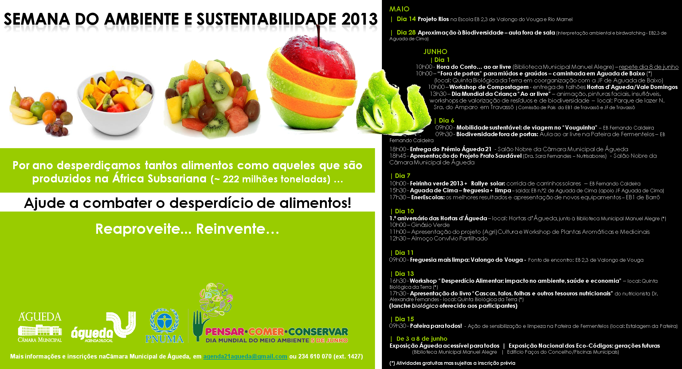Em Águeda serão diversas as iniciativas desenvolvidas como a entrega do Prémio Águeda 21 (6 de junho, 18:00, Salão Nobre da CMA), a apresentação do projeto Aguedense Prato Saudável (6 de junho, 18:45, Salão Nobre da CMA), bem como o workshop “Desperdício Alimentar: impacto no ambiente, saúde e economia” (13 de junho, 16:30, Quinta Biológica da Terra, Aguada de Cima) e a apresentação do livro “Cascas, talos, folhas e outros tesouros nutricionais” (13 de junho, 17:30, Quinta Biológica da Terra, Aguada de Cima), e demais atividades, é claro!