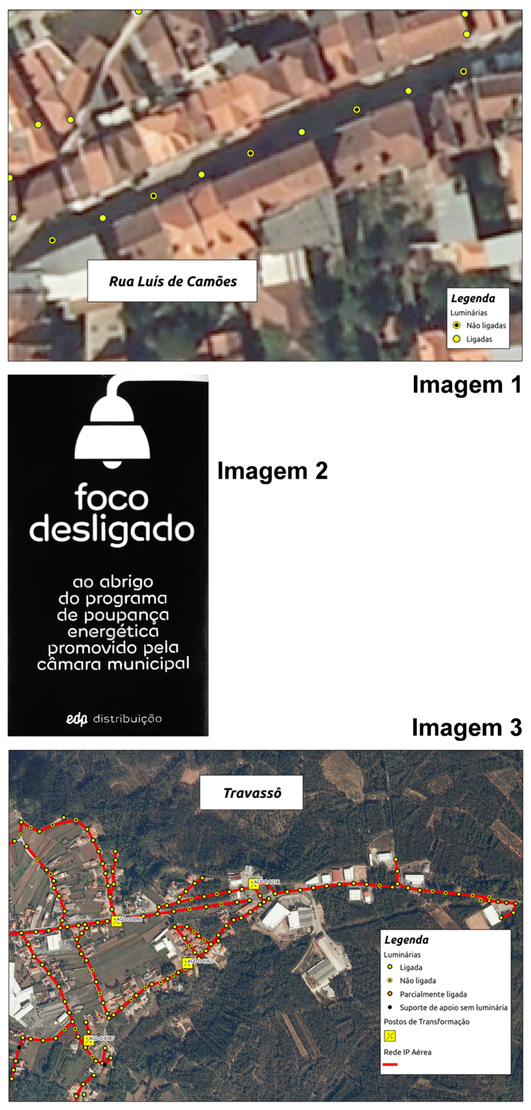Após análise das luminárias sobre a rede viária e edificado, foi tomada a decisão de desligar luminárias em zonas com excesso de luz, assegurando sempre a iluminação necessária para cruzamentos ou entradas de habitações, para que a redução não prejudique os cidadãos. Para tal, notifica-se a EDP relativamente aos pontos de luz a desligar, através de mapas descritivos de cada zona (exemplo, imagem 1). A EDP, por sua vez, dirige-se ao local e desliga as luminárias propostas, inserindo no respetivo poste um autocolante informativo com o título “foco desligado” (imagem 2). Foi desta forma que de um total de 21588 luminárias existentes no concelho foram desligadas 2949, até à data.