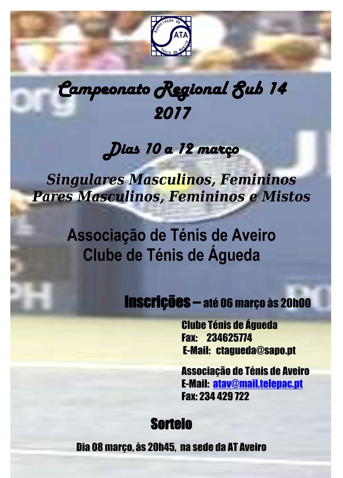 Campeonato Regional Sub 14 – organizado pelo Clube Ténis de Águeda e pela Associação de Ténis de Aveiro, nos dias 10 (provas de qualificação se as inscrições se justificarem) 11 e 12 quadros principais masculinos e femininos, com inicio às 10h.